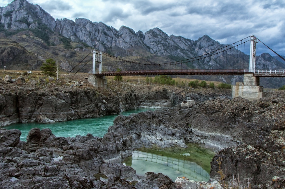 Мост через реку Катунь в самом глубоком месте (глубина Катуни тут более 70 м). Живописное ущелье реки.